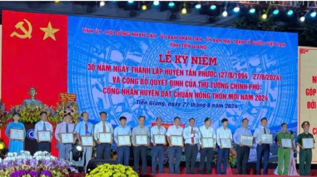 Ảnh: Trao thưởng cho các tập thể, cá nhân có thành tích xuất sắc trong xây dựng huyện nông thôn mới Tân Phước, đồng chí Lê Trung Hiếu – Phó Viện trưởng Viện KSND huyện Tân Phước, nay là Phó Viện trưởng Viện kiểm sát nhân dân khu vực 3 – tỉnh Đồng Tháp (thứ tám từ phải qua)