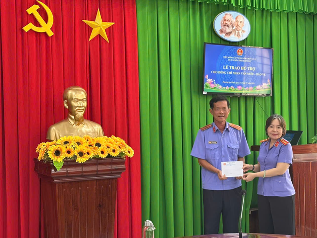 Tại buổi trao hỗ trợ, đại diện Lãnh đạo Viện đã ân cần thăm hỏi sức khỏe, động viên tinh thần và trao số tiền 1.000.000 đồng từ Quỹ Nghĩa tình Kiểm sát nhằm hỗ trợ một phần chi phí khám bệnh và mua thuốc điều trị cho đồng chí Nhan Văn Nuôi.